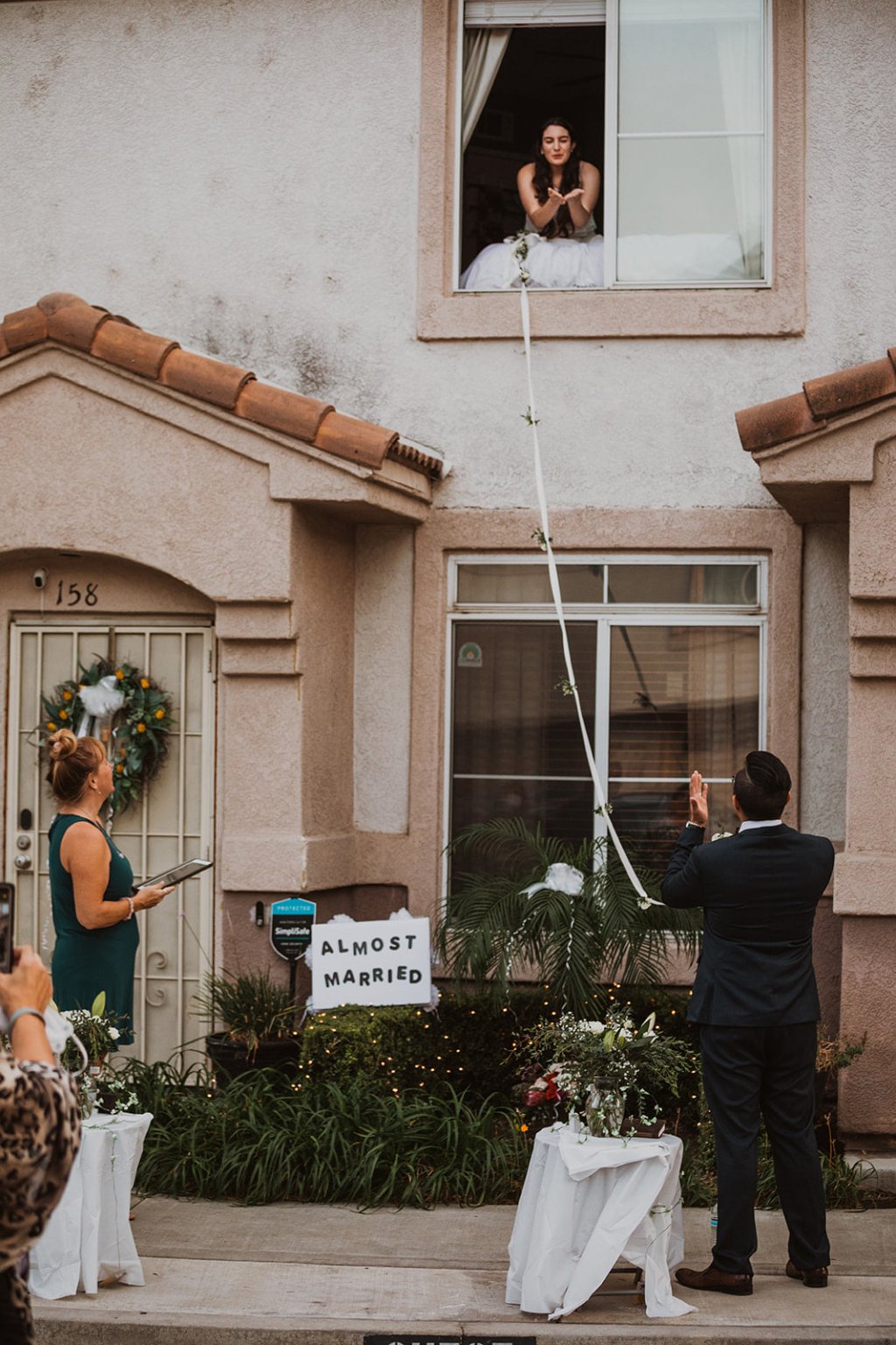 Foto Mireasă cu Covid, în carantină, face nunta de la fereastra dormitorului, cu mirele sub geam