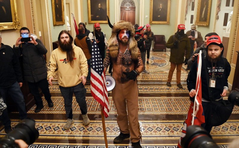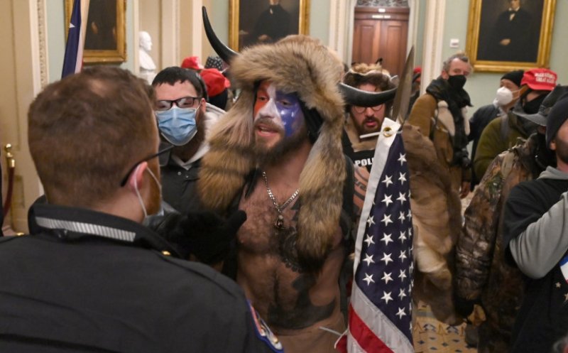 Bărbatul cu căciulă de blană și coarne, care intrat în clădirea Capitoliului la bustul gol și cu fața pictată, a fost identificat de presa americană drept Jake Angeli, un susținător înfocat al lui Donald Trump și suporter al mișcării QAnon.